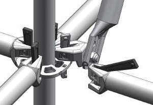 盤(pán)扣式腳手架起源于德國(guó),為歐洲和美洲的主流產(chǎn)品,支撐架分為立桿及橫桿、斜桿,圓盤(pán)上有八個(gè)孔,四個(gè)小孔為橫桿專用;四個(gè)大孔為斜桿專用。橫桿、斜桿的連接方式均為插銷式的,可以確保桿件與立桿牢固連結(jié)。橫桿、斜桿接頭特別依照管的圓弧制造,與立桿鋼管呈整面接觸,敲緊插銷后,呈三點(diǎn)受力( 接頭上下二點(diǎn)及插銷對(duì)圓盤(pán)一點(diǎn))可牢牢固定,增加結(jié)構(gòu)強(qiáng)度并傳遞水平力,橫桿頭與鋼管身采用滿焊固定,力量傳遞無(wú)誤。而斜桿頭為可轉(zhuǎn)動(dòng)接頭,以鉚釘將斜桿頭與鋼管身固定。至于立桿的連接方式是以四方管連接棒為主,而連接棒已固定在立桿上,不用另外的接頭組件來(lái)組合,可省卻材料遺失及整理的麻煩。